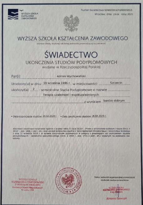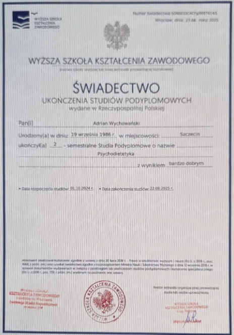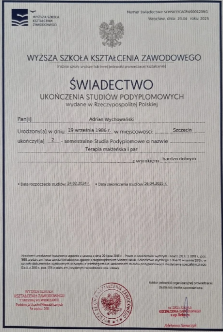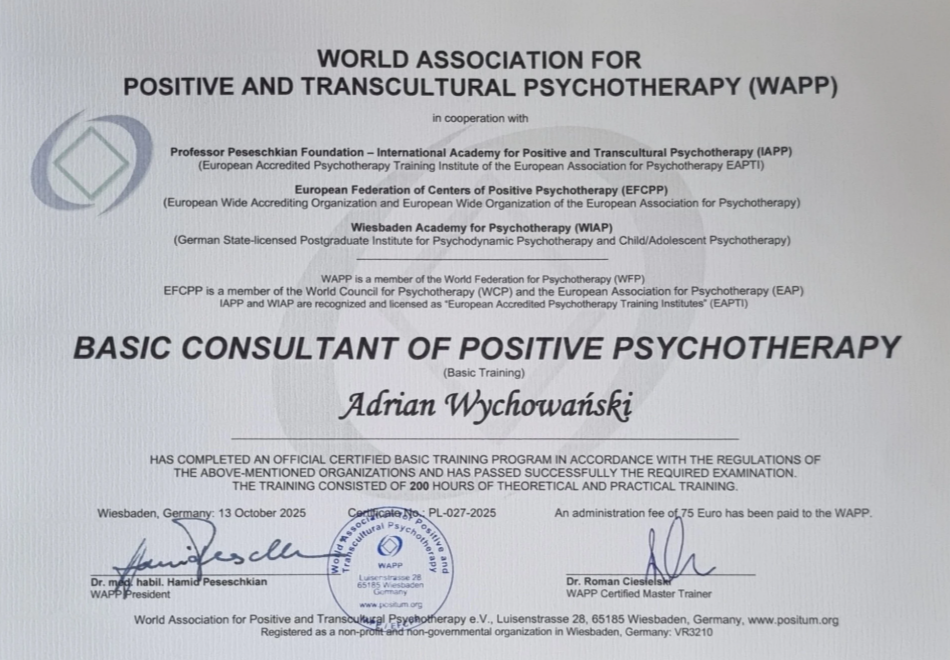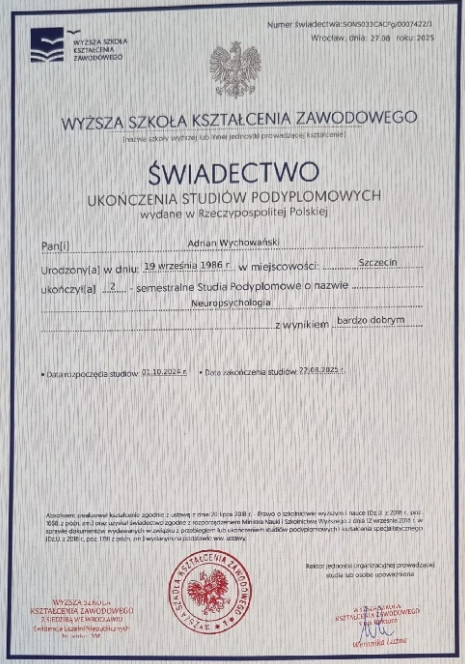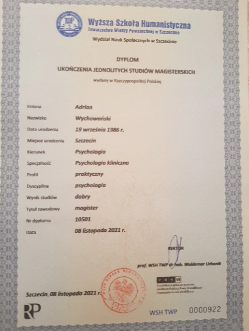 Jestem psychologiem, absolwentem WSH TWP w Szczecinie. Należę do Polskiego Towarzystwa Psychologicznego oraz Polskiego Towarzystwa Psychiatrycznego. Moje kompetencje rozwijałem poprzez liczne studia podyplomowe, m.in. z psychotraumatologii, psychologii transportu, seksuologii klinicznej, terapii par i uzależnień, doradztwa psychospołecznego, zarządzania zasobami ludzkimi, public relations, a także z zakresu psychologii klinicznej oraz neuropsychologii. Ukończyłem również studia magisterskie z pedagogiki o specjalności doradztwo zawodowe i personalne. Uzyskałem także tytuł konsultanta Psychoterapii Pozytywnej z akredytacją Instytutu WAPP w Wiesbaden (Wiesbadener Akademie für Psychotherapie).