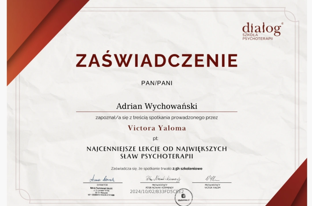 Pan Adrian Wychowański to bardzo profesjonalny i empatyczny psycholog. Terapia par, w której uczestniczyliśmy z żoną, pomogła nam lepiej się zrozumieć, poprawić komunikację i spojrzeć na nasze problemy z nowej perspektywy. Pan Adrian tworzy bezpieczną, spokojną atmosferę i potrafi uważnie słuchać obu stron, nie oceniając. Dzięki terapii czujemy się bliżej siebie i mamy konkretne narzędzia do pracy nad relacją. Z pełnym przekonaniem polecamy terapię par u pana Adriana.