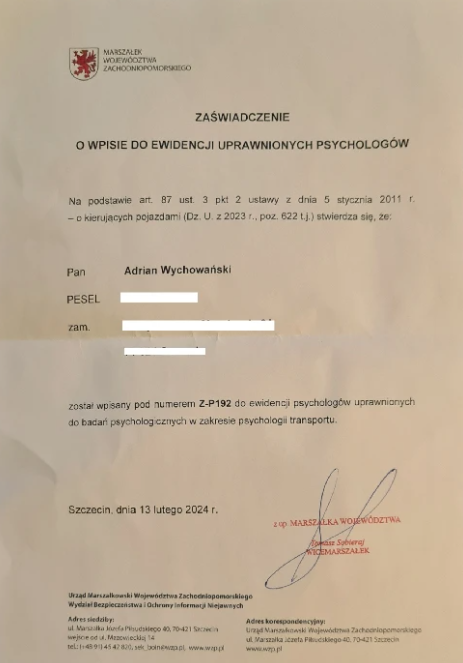 | Badanie psychologiczne po zatrzymaniu prawa jazdy | 150 |