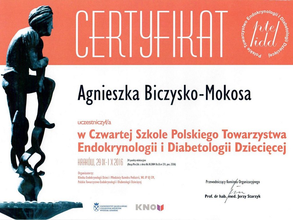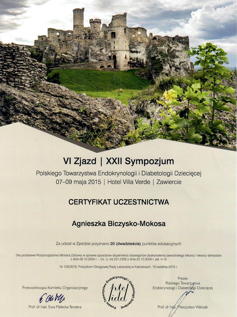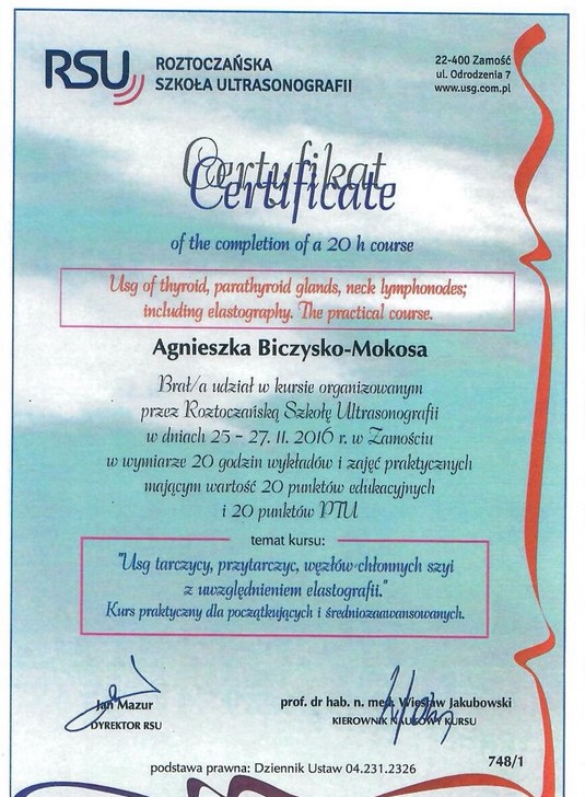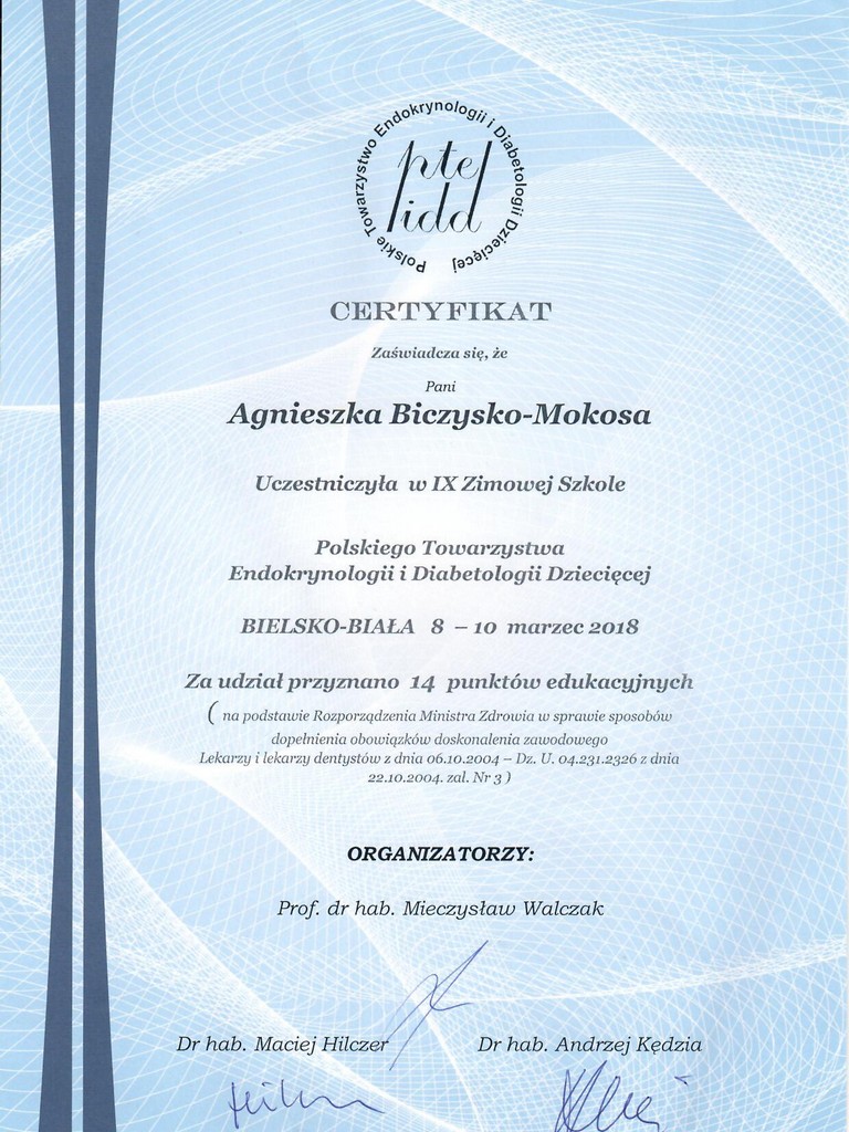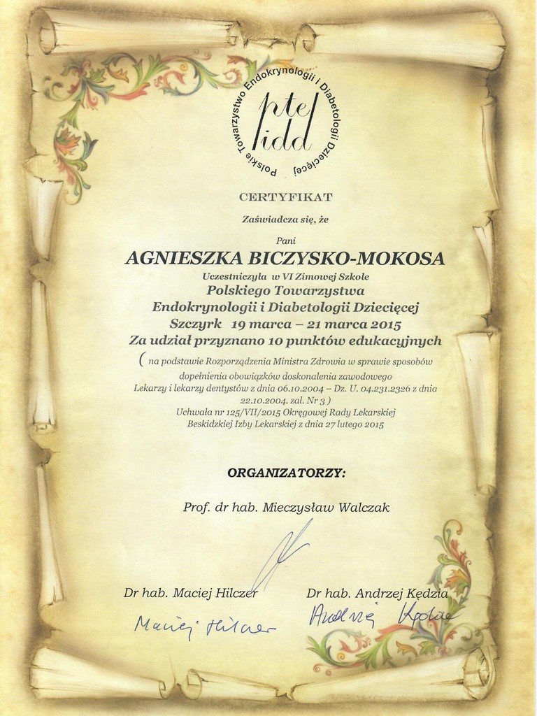 W 1999 r. ukończyłam z wyróżnieniem studia na Wydziale Lekarskim Pomorskiej Akademii Medycznej (aktualnie Pomorski Uniwersytet Medyczny). Od 2001r jestem zatrudniona w Klinice Pediatrii, Endokrynologii, Diabetologii, Chorób Metabolicznych i Kardiologii Wieku Rozwojowego PUM w Szczecinie, gdzie pracuję jako lekarz i nauczyciel akademicki. Prowadzę zajęcia dydaktyczne w języku polskim i angielskim. W 2009r uzyskałam tytuł specjalisty w dziedzinie pediatrii. W 2013r otrzymałam stopień naukowy doktora nauk medycznych za pracę pt. „Ocena efektów terapii oraz metod przewidywania wzrostu ostatecznego u dzieci z niedoborem hormonu wzrostu leczonych rekombinowanym, ludzkim hormonem wzrostu w regionie Pomorza Zachodniego, w latach 2000 – 2010”. W 2017r uzyskałam tytuł specjalisty endokrynologii i diabetologii dziecięcej. W czasie dwudziestoletniej praktyki zawodowej zdobyłam doświadczenie zarówno w pracy szpitalnej jak i ambulatoryjnej. Jestem członkiem Polskiego Towarzystwa Endokrynologii i Diabetologii Dziecięcej. Regularnie biorę udział w zjazdach, konferencjach naukowych oraz projektach badawczych z ww dziedzin. Jestem autorem i współautorem ponad 40 prac naukowych. Dodatkowo poszerzam swoje umiejętności uczestnicząc w kursach z ultrasonografii tarczycy.
