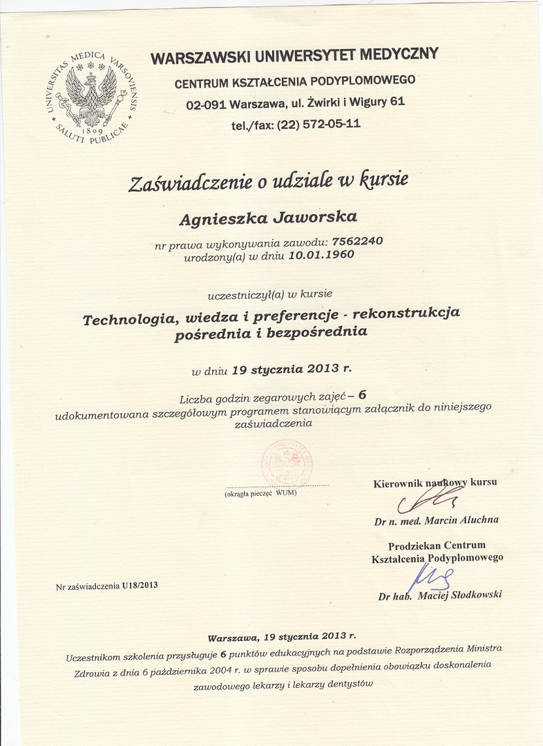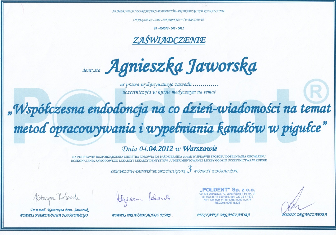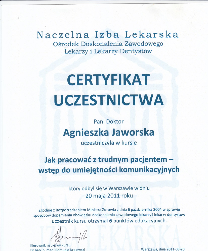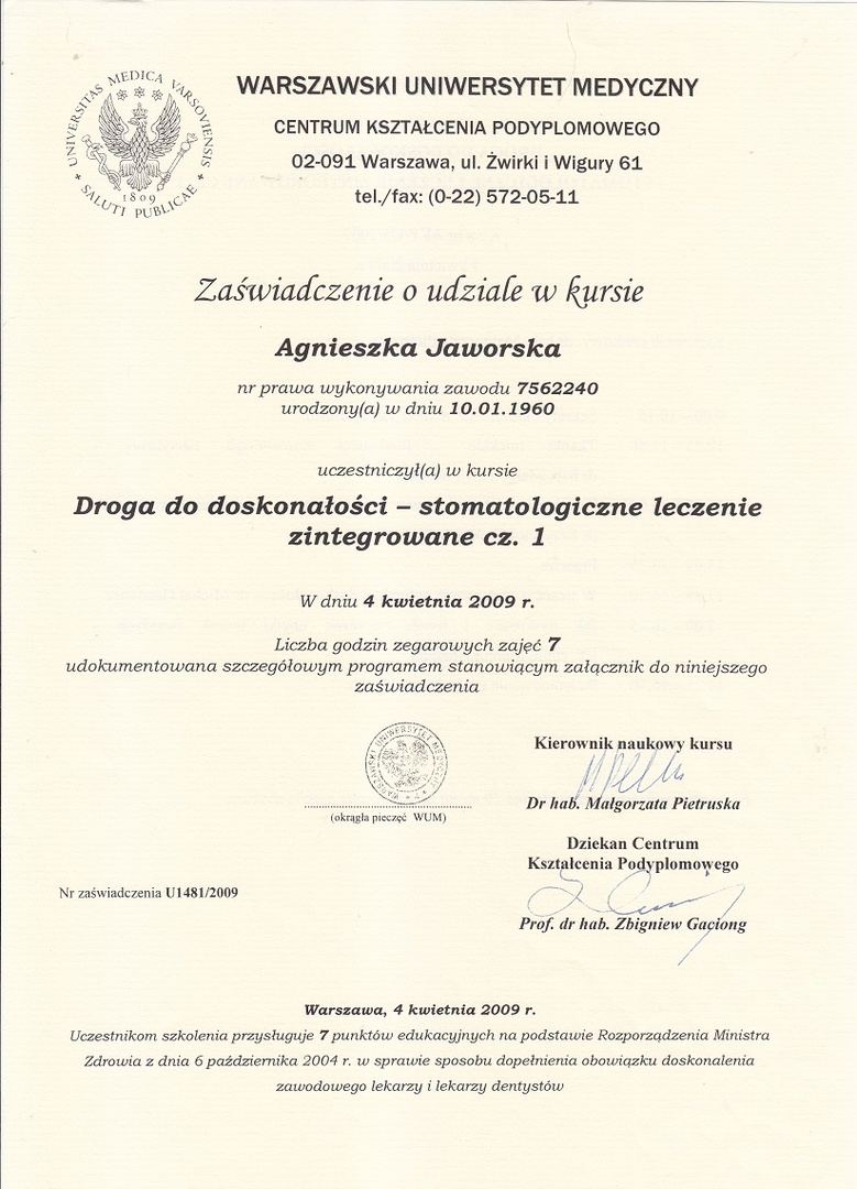 Do pani doktor trafiłem po tym, jak uciekłem od niekompetentnej i straszącej mnie dentystki. Od razu poczułem się lepiej. Mam zaufanie do dr.Jaworskiej. Nigdy nie było żadnych komplikacji po wizycie u niej. Rzeczowo i dokładnie mówi, co robi. Z rozmów z nią wiem, że jest na bieżąco z najnowszymi osiągnięciami stomatologii. Mój syn, który unikał gabinetów dentystycznych, przekonał się właśnie do dr. Jaworskiej. Zasługuje na same piątki.