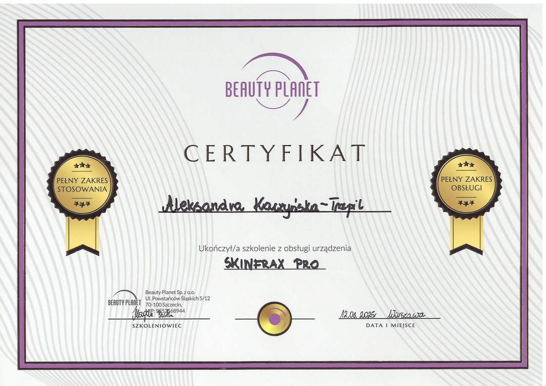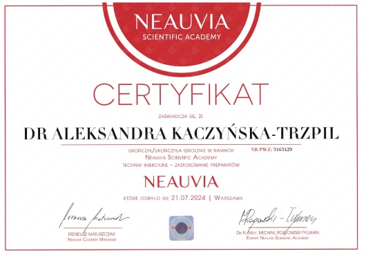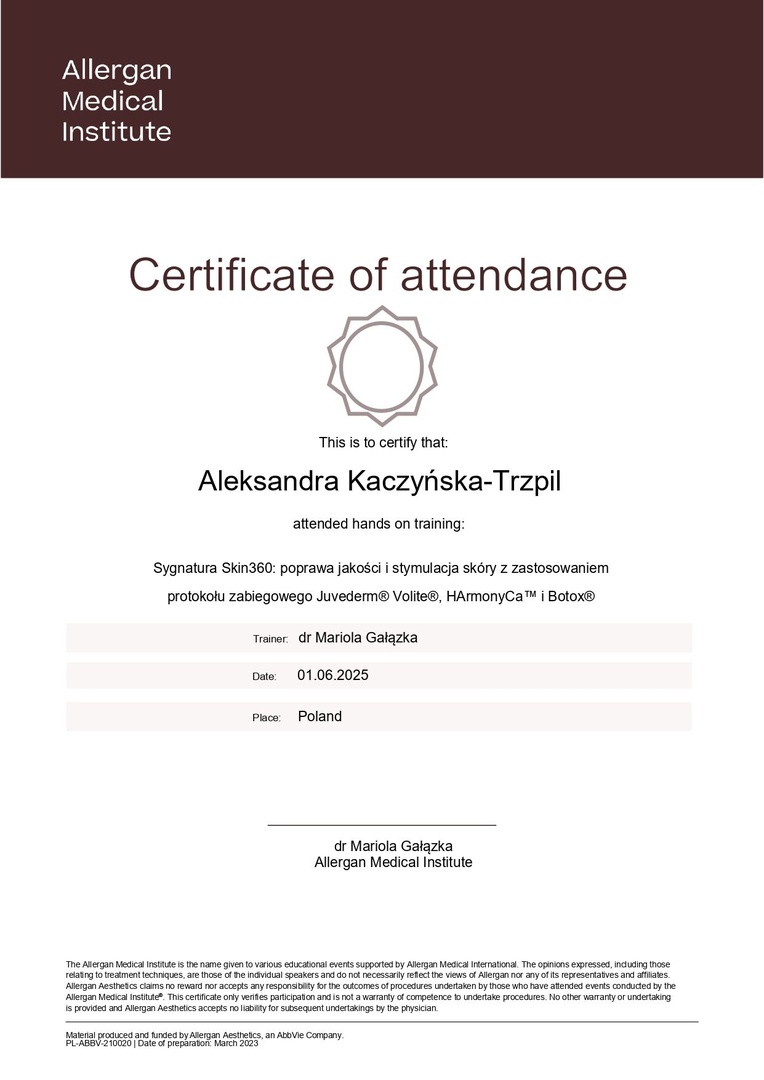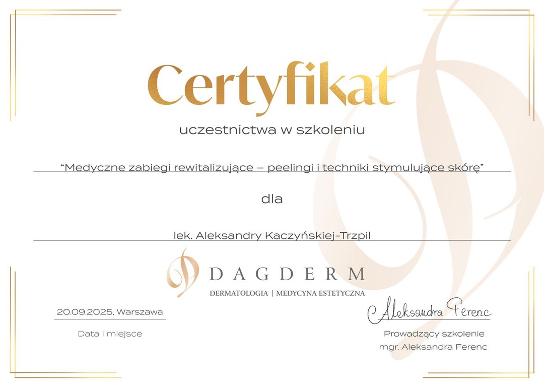 W 2014 r. ukończyłam studia na I Wydziale Lekarskim Warszawskiego Uniwersytetu Medycznego. W trakcie studiów byłam aktywnym członkiem Studenckiego Koła Naukowego przy Katedrze i Klinice Dermatologicznej WUM, gdzie zdobywałam doświadczenie w zakresie dermatologii i wenerologii podczas dyżurów, stażu w Klinice Dermatologii Centralnego Szpitala Klinicznego MSWiA w Warszawie oraz jako współautor prac naukowych. Odbyłam szkolenie specjalizacyjne z dermatologii i wenerologii w Klinice Dermatologicznej WUM. Posiadam szerokie doświadczenie w pracy klinicznej z pacjentem zarówno w oddziale szpitalnym, jak i w poradni dermatologicznej. Jestem członkiem Polskiego Towarzystwa Dermatologicznego oraz Międzynarodowego Stowarzyszenia Trichoskopii. Regularnie uczestniczę w szkoleniach i konferencjach, w tym zagranicznych, aby jak najlepiej nieść pomoc moim Pacjentom.