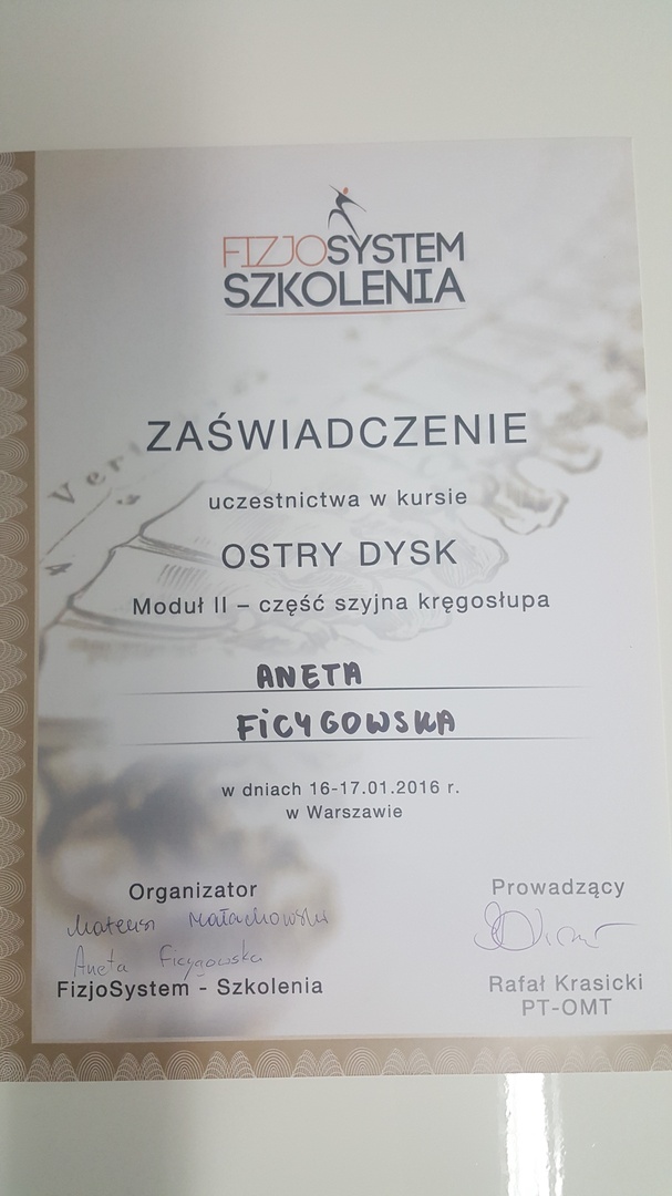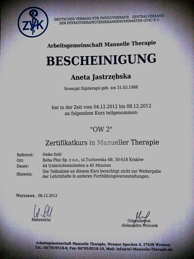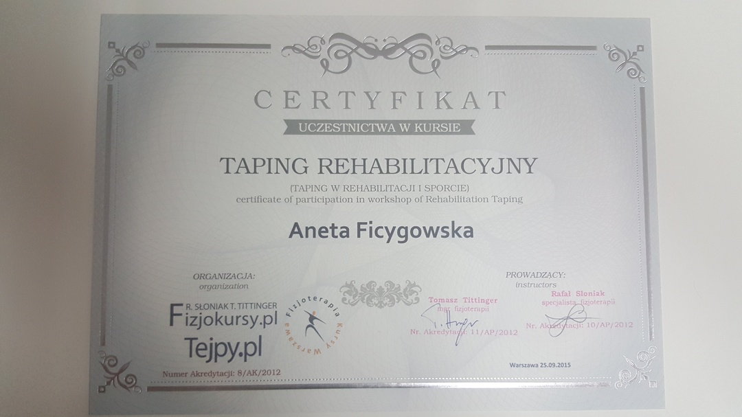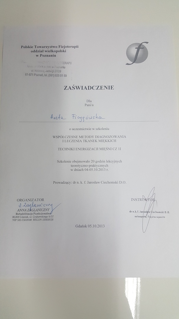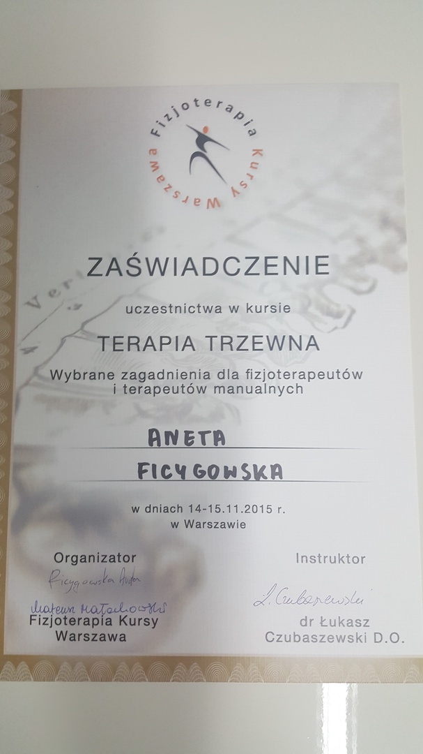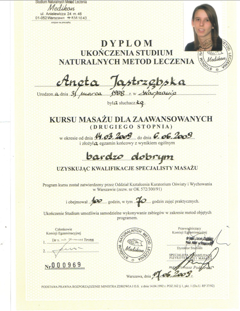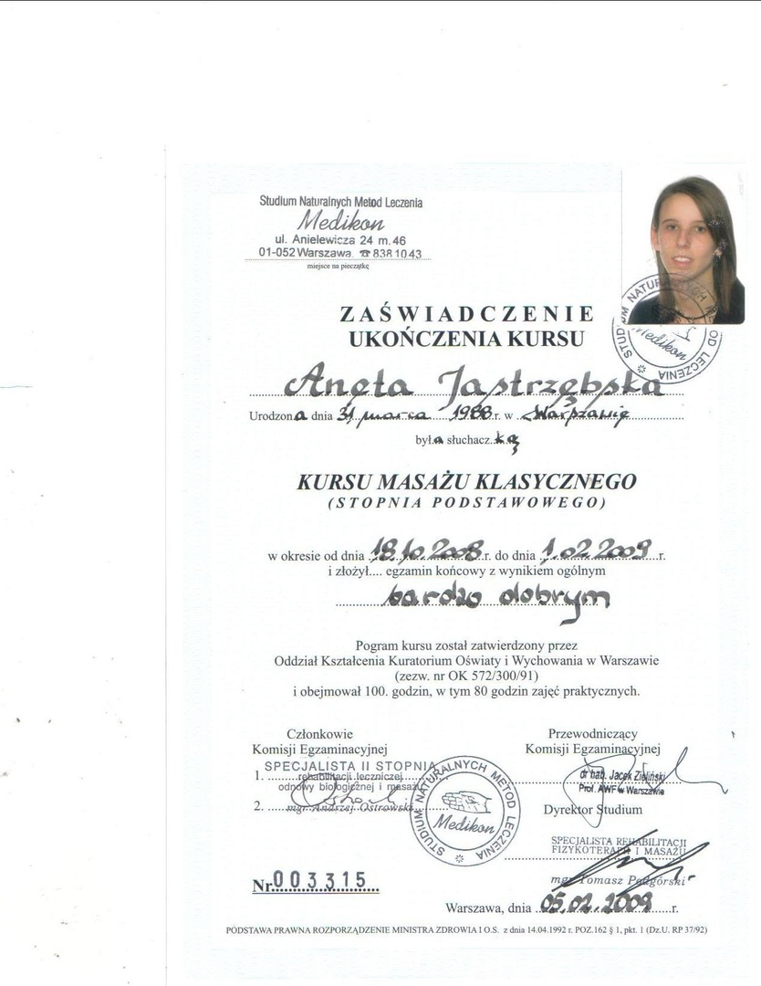 Z całą pewnością polecam Panią Anetę jako wybitnego specjalistę. Posiadana przez Nią wiedza merytoryczna daje Jej kompetencje do działania, a wrodzone i nabyte umiejętności w zakresie traktowania ciała i stosowania właściwych i adekwatnych do schorzeń technik pracy nad nim czynią Ją niezwykle skuteczną w prowadzonej terapii.