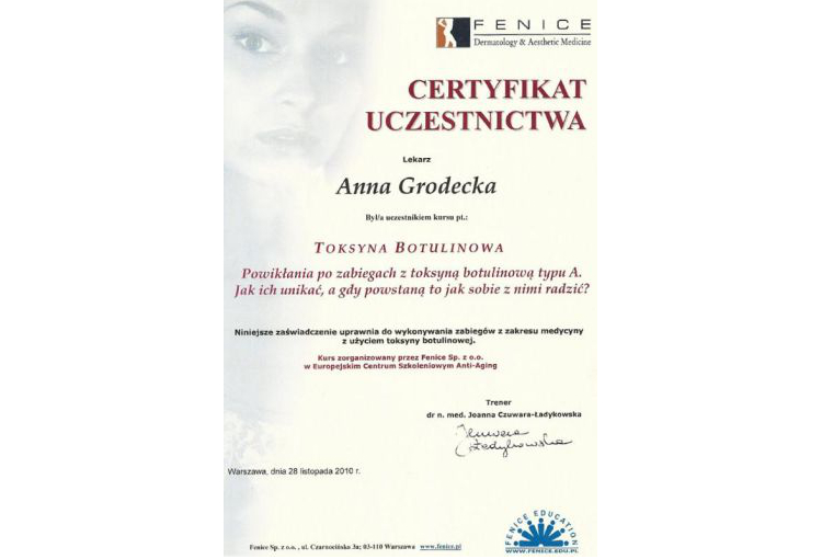 Dr Anna Grodecka jest absolwentką Collegium Medicum UMK w Toruniu. Przez 4 lata pracowała jako anestezjolog w Uniwersyteckim Szpitalu Dziecięcym w Krakowie. Jednocześnie, jako asystent w Katedrze Anestezjologii Collegium Medicum UJ, zajmowała się pracą dydaktyczną i naukową. Prowadziła zajęcia ze studentami Wydziału Lekarskiego oraz ze studentami School Of Medicine in English. Odbyła wiele kursów i staży w Polsce i za granicą. Jest certyfikowanym instruktorem ETC Polskiej Rady Resuscytacji. Od 2009 roku zajmuje się medycyną estetyczną. Umiejętności zdobywała w renomowanych ośrodkach w Warszawie i Krakowie. Z dużym powodzeniem wykonuje wiele zabiegów w zakresie zarówno medycyny estetycznej jak i przeciwstarzeniowej. Stale podnosi swoje kwalifikacje uczestnicząc w szkoleniach, konferencjach i kongresach naukowych. Jest członkiem Polskiego Towarzystwa Medycyny Estetycznej i Anti-Aging Polskiego Towarzystwa Lekarskiego oraz World Society Interdisciplinary AntiAging Medicine (WOSIAM). Aktualnie doktor Grodecka pracuje i specjalizuje się w dermatologii i wenerologii.