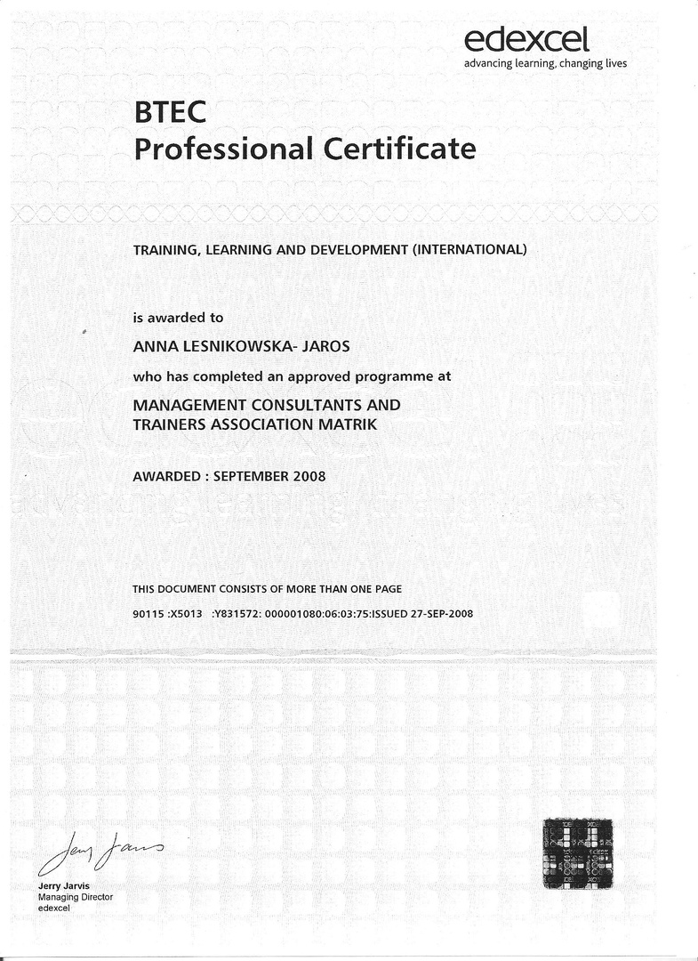 Jestem psychologiem i specjalistką ds. rozwoju zawodowego i osobistego oraz trenerem (BTEC Professional Certificate). Od 16 lat pracuję jako psycholog biznesu dla firm.