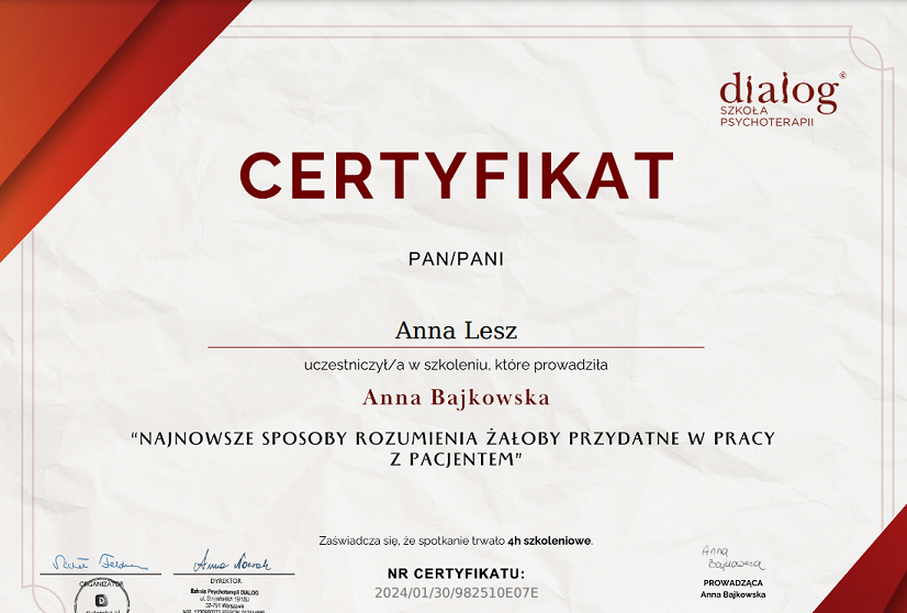 Pani Ania jest psychologiem godnym polecenia. Jestem zachwycona jej profesjonalizmem i podejściem do pacjenta.