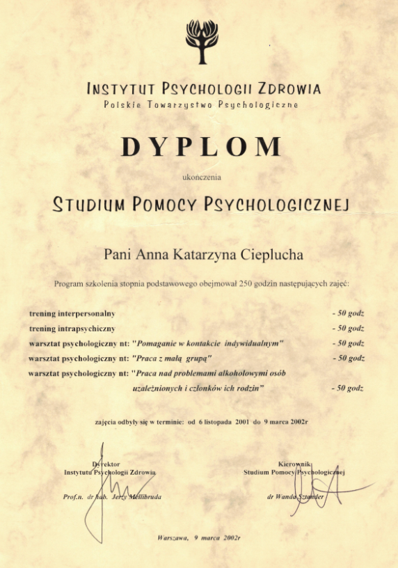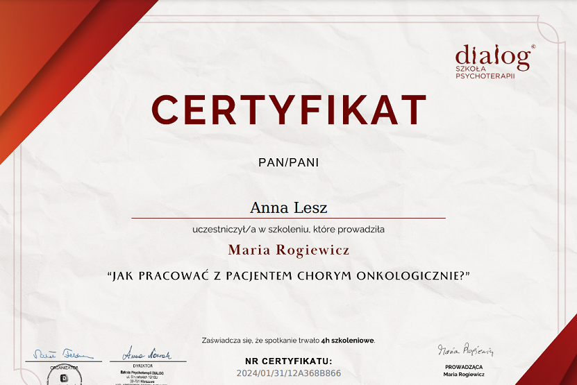 Odkąd pamiętam, zawsze chciałam pomagać drugiemu człowiekowi. Jestem osobą wierzącą, żoną i mamą.Jestem absolwentką 5-letnich magisterskich studiów psychologicznych na Uniwersytecie Łódzkim. Ponadto, ukończyłam studia podyplomowe ( 235 godzin) w zakresie psychoonkologii klinicznej na Uniwersytecie Jagiellońskim, a także cykl szkoleń z zakresu pomocy psychologicznej (250 godzin) w Instytucie Psychologii Zdrowia w Warszawie. Posiadam 16 letnie doświadczenie zawodowe zwłaszcza w pracy z chorymi onkologicznie i ich rodzinami w ramach domowej opieki paliatywnej. Mam również 8 letnie doświadczenie w pracy terapeutycznej z dziećmi jako psycholog-nauczyciel, gdzie zajmowałam się diagnozą, terapią dzieci z orzeczeniem, prowadząc grupowe zajęcia psychoedukacyjne oraz pracując z dzieckiem zdolnym. Cały czas uczestniczę w szkoleniach psychoterapeutycznych w ramach Szkoły Psychoterapeutycznej DIALOG, stale podnosząc swoje kompetencje zawodowe. Prowadzę szkolenia dla personelu medycznego dotyczące radzenia sobie ze stresem czy też przeciwdziałaniu wypaleniu zawodowemu. Jestem Członkiem Polskiego Towarzystwa Psychoonkologicznego. Pracuję zgodnie z Kodeksem Etyczno - Zawodowym Psychologa. Uwielbiam góry, podróże, dobrą muzykę i książkę. Jestem zakręcona na punkcie pięknych zapachów zamkniętych we flakonach :)