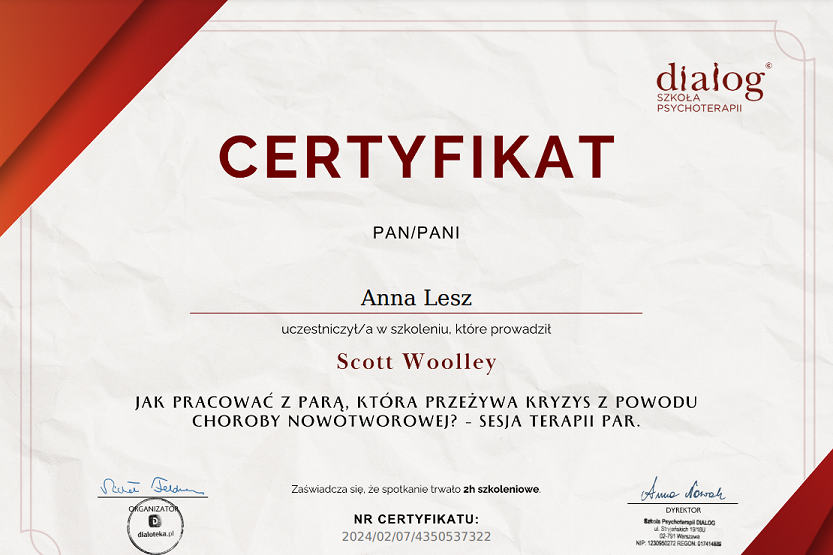 Świetna specjalistka , pomogła mi w najtrudniejszym momencie mojego życia gdy mój tata bardzo mocno zachorował i nie byłam w stanie funkcjonować , bardzo mi pomogła z moimi emocjami i myślami w trudnym okresie choroby nowotworowej oraz przygotować się na nadchodzącą śmierć … bardzo kojąca rozmowa oraz pomoc fachową w tak trudnym dla mnie czasie . Bardzo polecam , świetna osoba , empatyczna wyrozumiała naprawdę bardzo dobry psycholog . Nie zastąpiona w tym trudnym dla mnie czasie ..