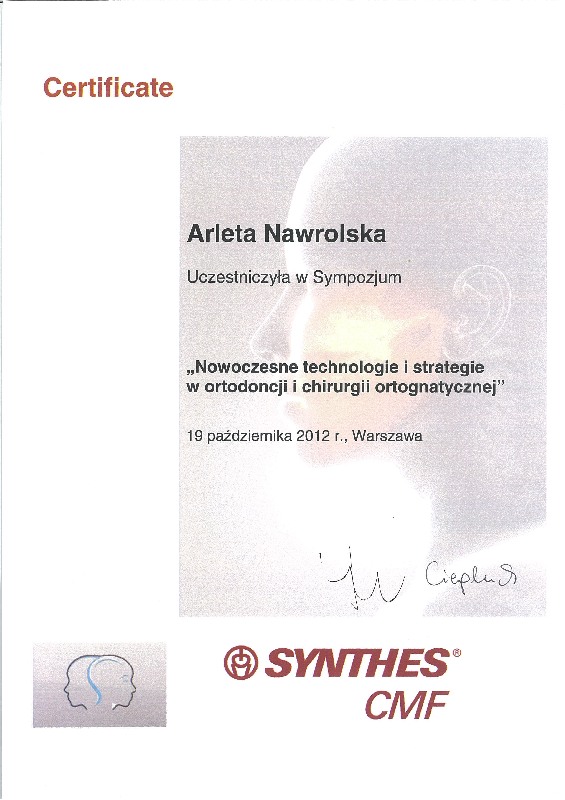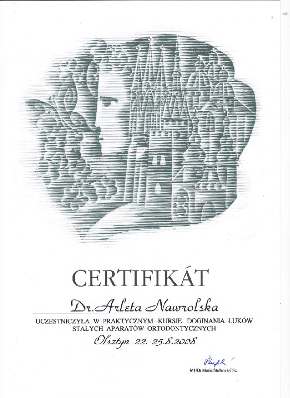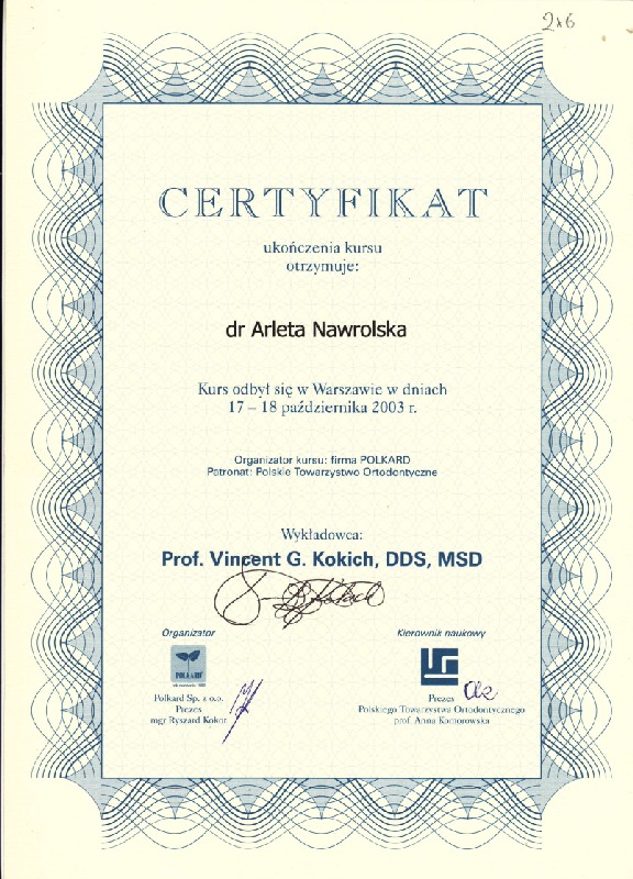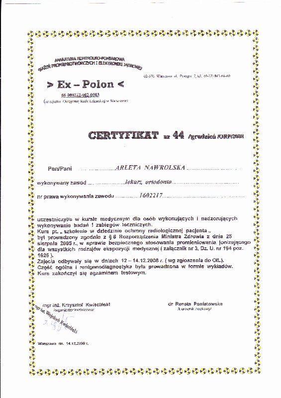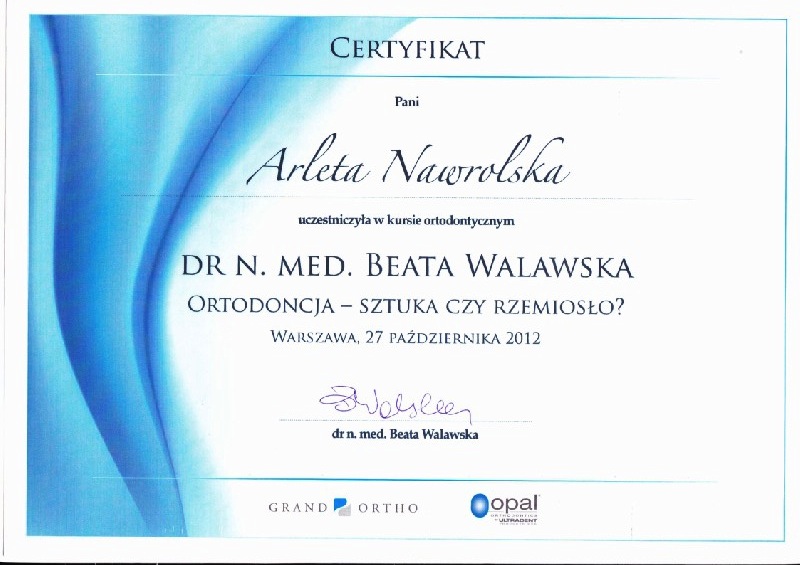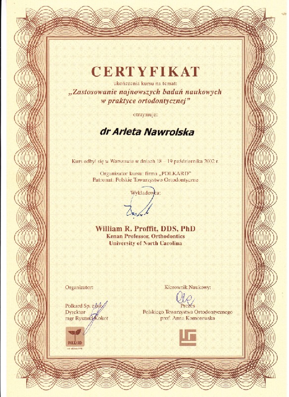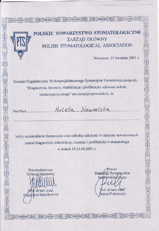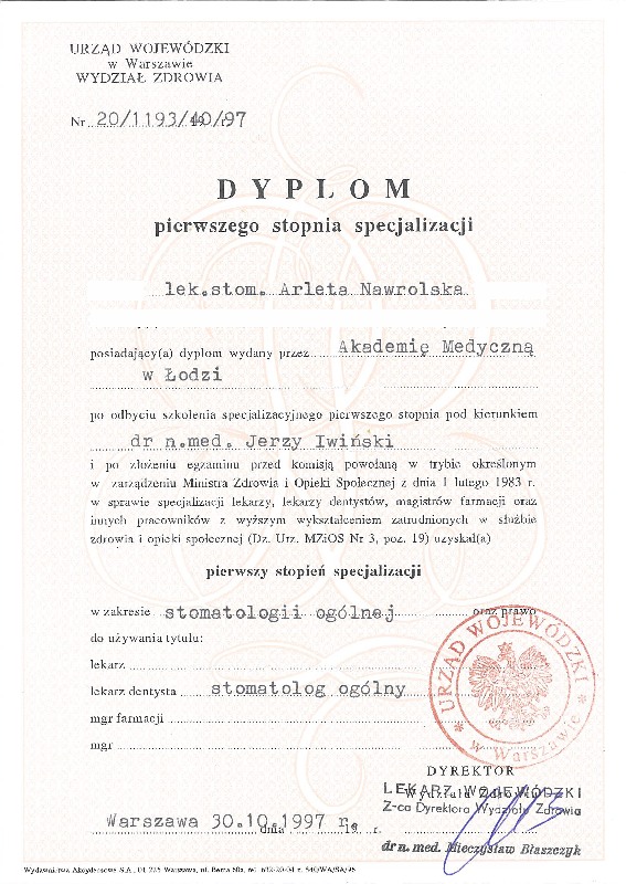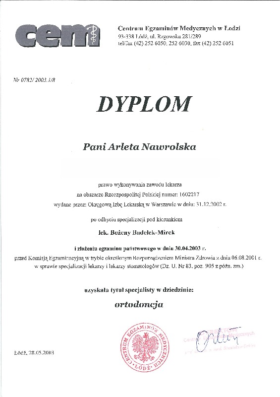 W 1997 roku uzyskałam tytuł specjalisty z zakresu stomatologii ogólnej, w 2003 tytuł specjalisty z zakresu ortodoncji.