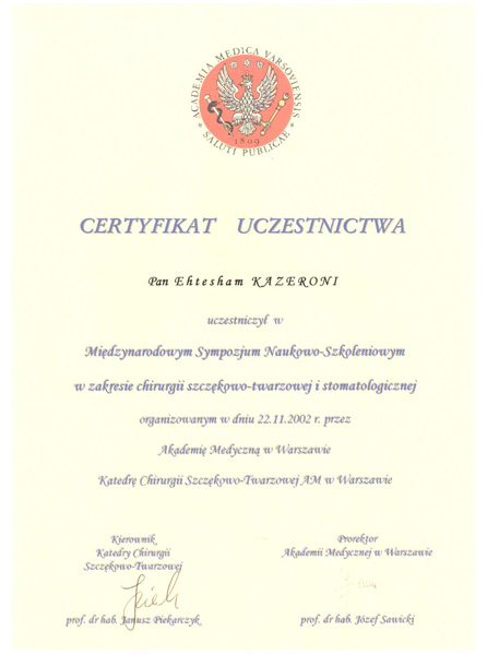 W codziennej pracy zawodowej korzystam z umiejętności i doświadczeń, które nabyłem podczas studiów podyplomowych w warszawskiej Akademii Medycznej, pracy w II Klinice Chirurgii Szczękowo-Twarzowej w Szpitalu im. Dzieciątka Jezus, Centrum Leczenia Obrażeń przy ulicy Lindleya 4.