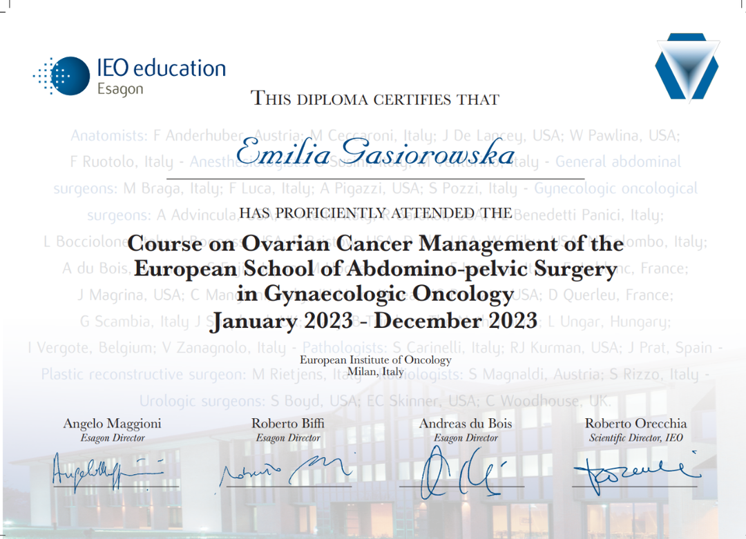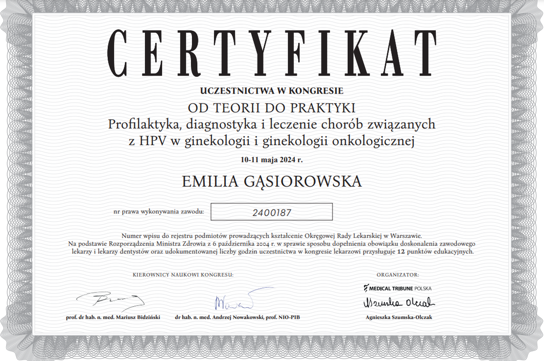 - Uzyskanie tytułu specjalisty w Ginekologii Onkologicznej – 2019 r.