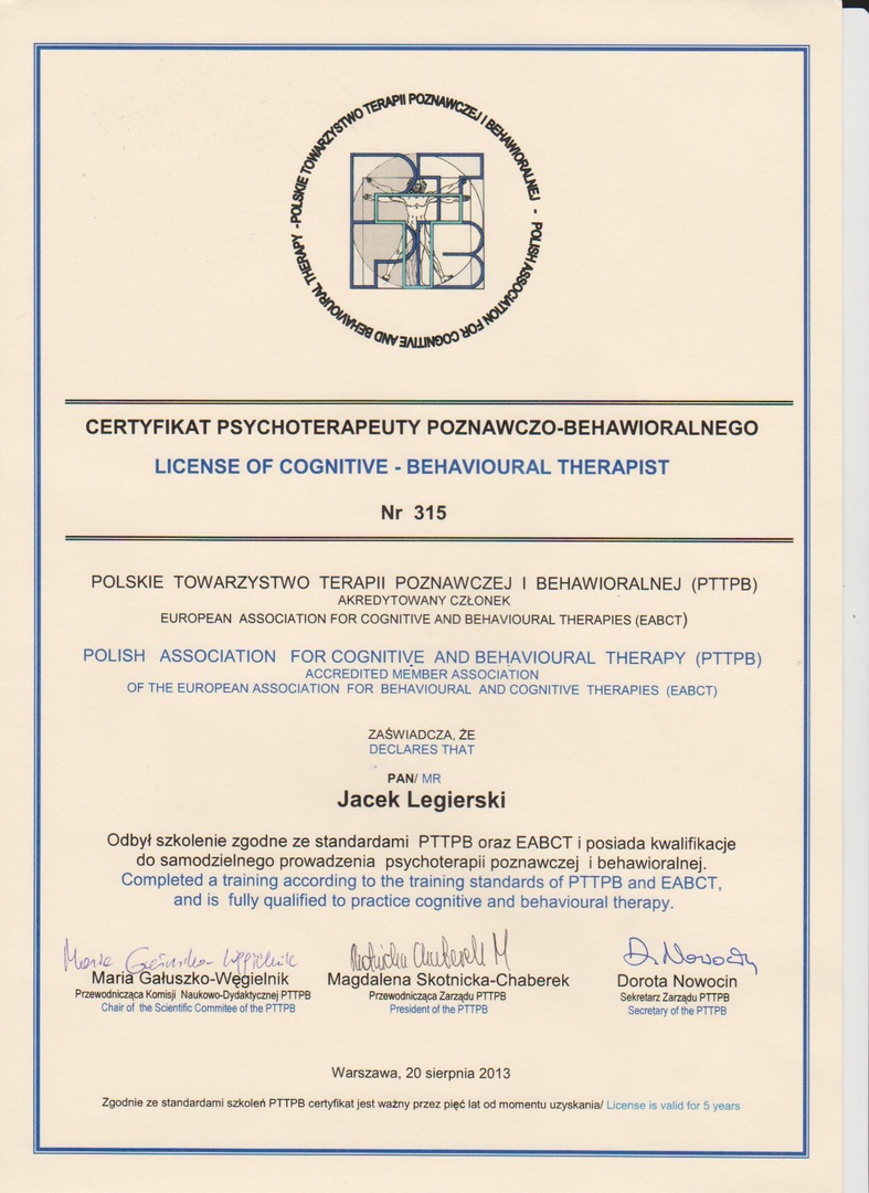 Bardzo dobry terapeuta. Dzięki jego pomocy pozbyłem się silnych lęków, które uniemożliwiały mi normalne życie. Szczerze polecam.