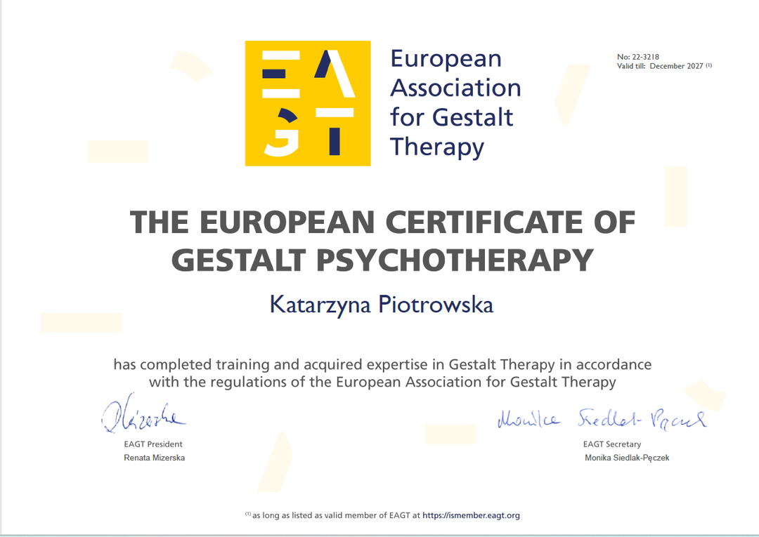 Jestem certyfikowaną psychoterapeutką w nurcie humanistyczno-egzystencjalnym Gestalt (Certyfikat EAGT -European Association for Gestalt Therapy),