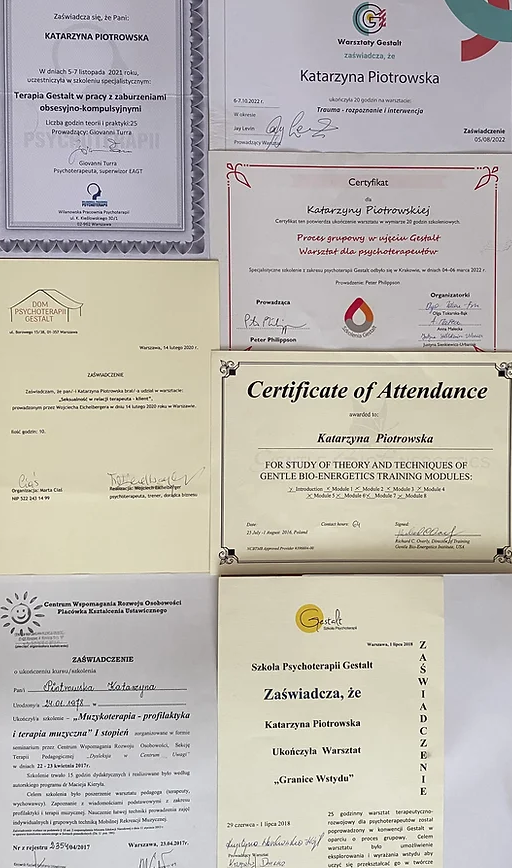 Stale poszerzam swoją wiedzę i umiejętności uczestnicząc w najnowszych szkoleniach m.in, z zakresu traumy,