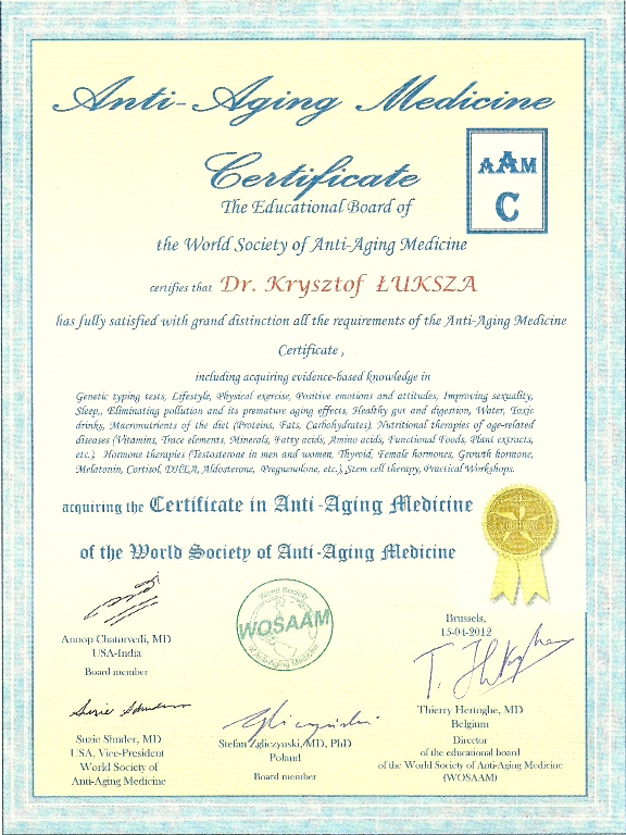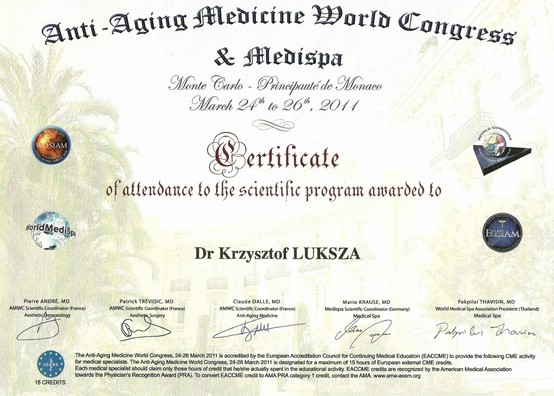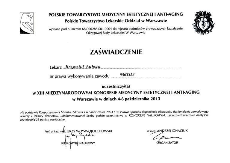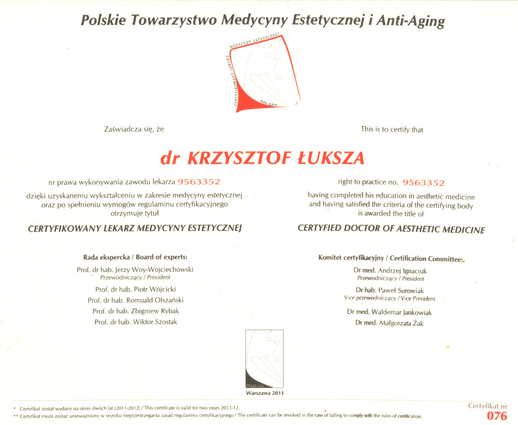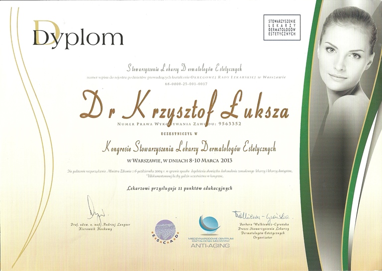 Lek. med. Krzysztof Łuksza jest absolwentem Poznańskiej Akademii Medycznej im. Karola Marcinkowskiego (obecnie Uniwersytet Medyczny) Przez wiele lat uczestniczył w wielu szkoleniach jak i kongresach. Przynależy do Polskiego Towarzystwa Medycyny Estetycznej i Anti-Aging oraz Stowarzyszenia Lekarzy Dermatologów Estetycznych. Podczas całej swojej kariery zawodowej dr Łuksza uczestniczy w wielu seminariach z zakresu specjalizacji medycyny estetycznej i profilaktyki przeciwstarzeniowej. Jest także absolwentem Podyplomowej Szkoły Medycyny Estetycznej oraz Międzynarodowej Szkoły Medycyny Przweciwstarzeniowej (World Society of Anti-Aging Medicine).