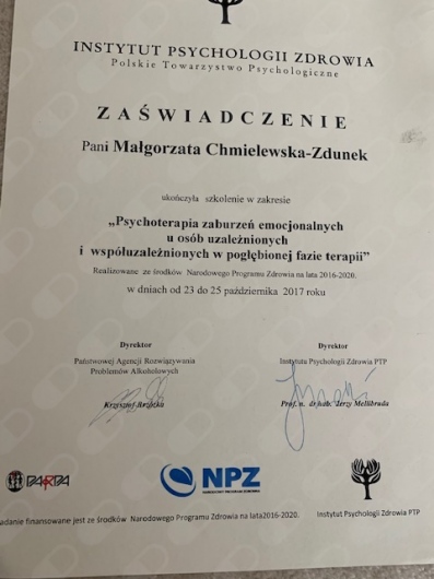 Jestem socjologiem małżeństwa i rodziny oraz psychoterapeutą poznawczo -behawioralnym.Ukończyłam 4 letnie studia podyplomowe w terapii poznawczo-behawioralnej CBT posiadającej członkostwo w Europen Association for Behawioural and Cognitive Terapies.