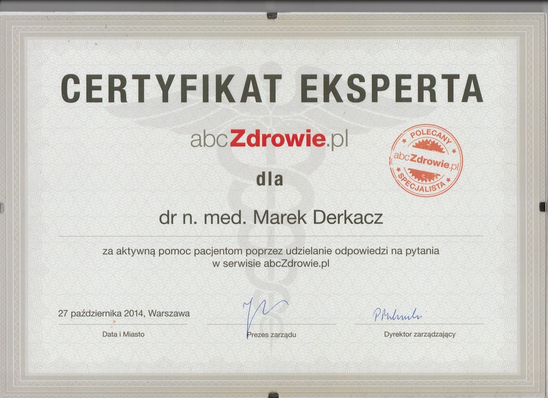Po wielomiesięcznych peregrynacjach po różnych gabinetach lekarskich – w których słyszałam jedynie, że muszę unikać stresu i mniej pracować (tudzież zażywać witaminy...) – rok temu trafiłam do Pana Doktora Marka Derkacza. Od tamtej pory należę do grona Jego wielbicieli. Jestem pod ogromnym wrażeniem wiedzy, jaką Pan Doktor posiada, a także detektywistycznej umiejętności łączenia przez Niego faktów pozornie ze sobą niezwiązanych. Wyróżniają Go również ponadprzeciętne zdolności interpersonalne. Pan Doktor jest wyjątkowym lekarzem, bo jest wyjątkowym CZŁOWIEKIEM: niezwykle wrażliwym, empatycznym, oddanym pacjentowi i swojej pracy, okazującym szacunek i zainteresowanie, emanującym ciepłem i …