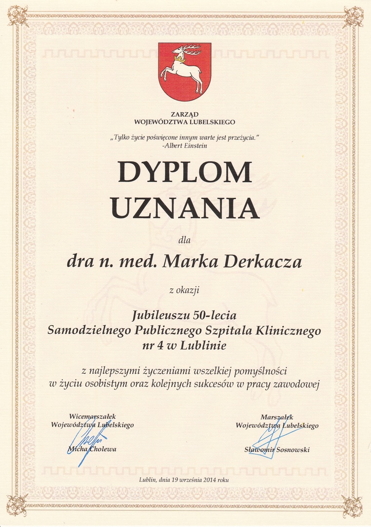 Po wielomiesięcznych peregrynacjach po różnych gabinetach lekarskich – w których słyszałam jedynie, że muszę unikać stresu i mniej pracować (tudzież zażywać witaminy...) – rok temu trafiłam do Pana Doktora Marka Derkacza. Od tamtej pory należę do grona Jego wielbicieli. Jestem pod ogromnym wrażeniem wiedzy, jaką Pan Doktor posiada, a także detektywistycznej umiejętności łączenia przez Niego faktów pozornie ze sobą niezwiązanych. Wyróżniają Go również ponadprzeciętne zdolności interpersonalne. Pan Doktor jest wyjątkowym lekarzem, bo jest wyjątkowym CZŁOWIEKIEM: niezwykle wrażliwym, empatycznym, oddanym pacjentowi i swojej pracy, okazującym szacunek i zainteresowanie, emanującym ciepłem i spokojem, o wysokiej kulturze osobistej, cierpliwym. Żaden inny lekarz nie poświęca pacjentowi tyle czasu, co Pan Doktor. W gabinecie Pana Marka Derkacza wizyta lekarska staje się spotkaniem człowieka szukającego pomocy z człowiekiem, który robi wszystko, aby jej udzielić.