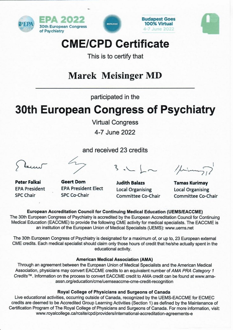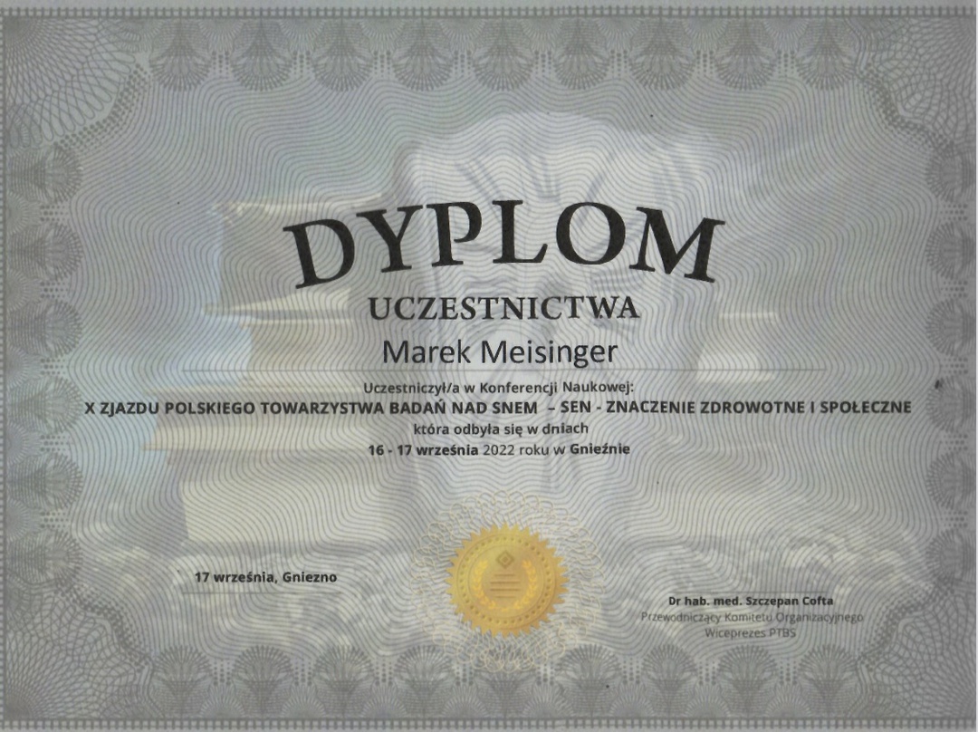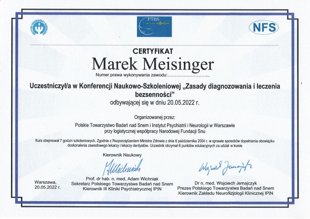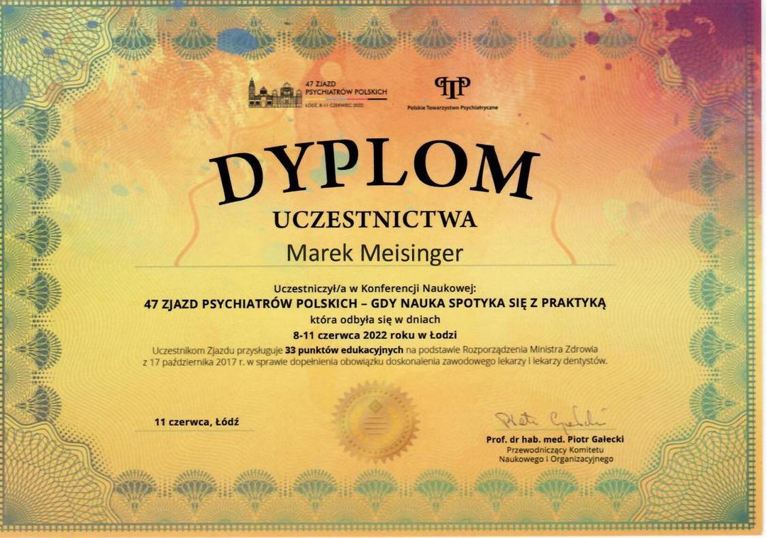 W 2010 roku uzyskałem tytuł specjalisty w dziedzinie psychiatrii. W trakcie szkolenia specjalizacyjnego odbyłem 3-letni staż (Training Scheme in Psychiatry) w University Hospital Limerick (Irlandia), pod patronatem Royal College of Psychiatrists oraz staże w Szpitalu Wojewódzkim w Gorzowie Wlkp. i Klinice Psychiatrii w Poznaniu.