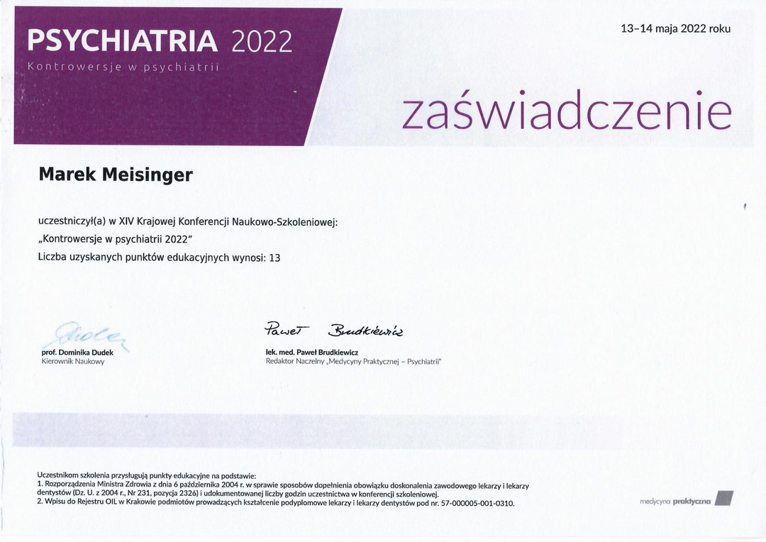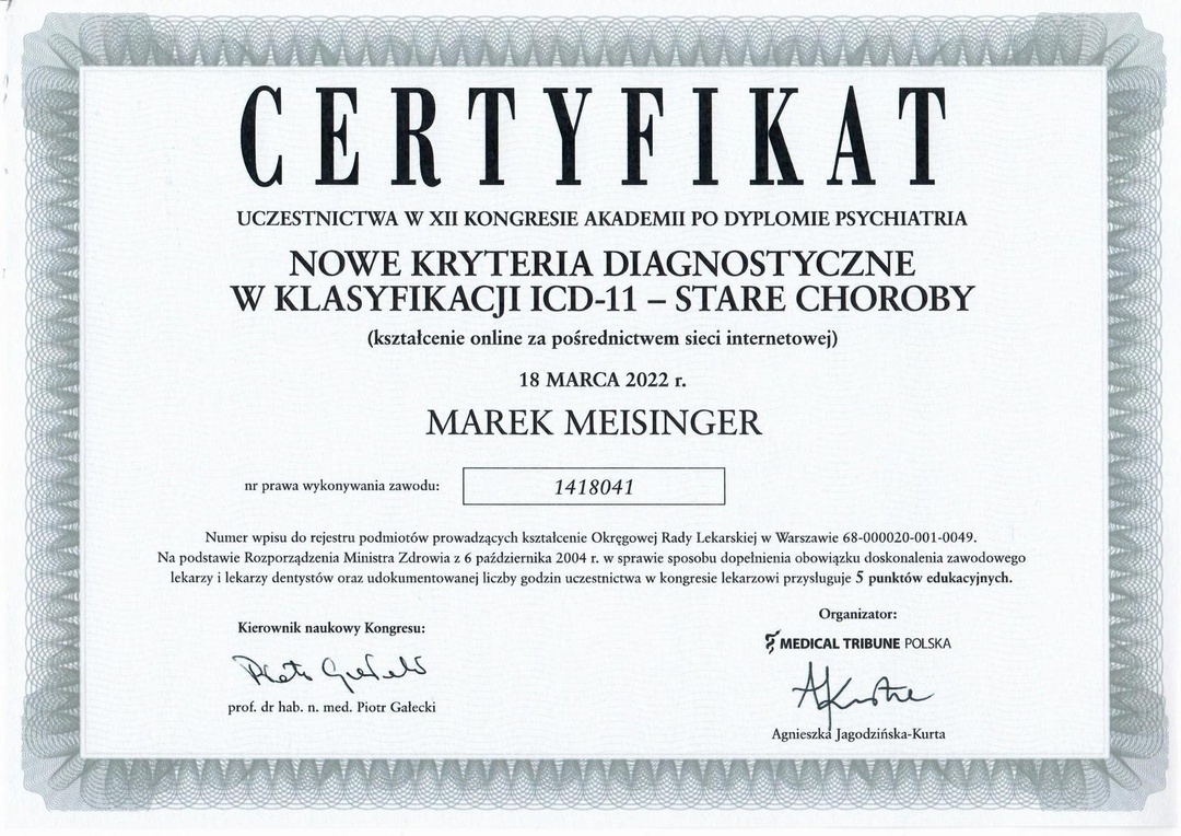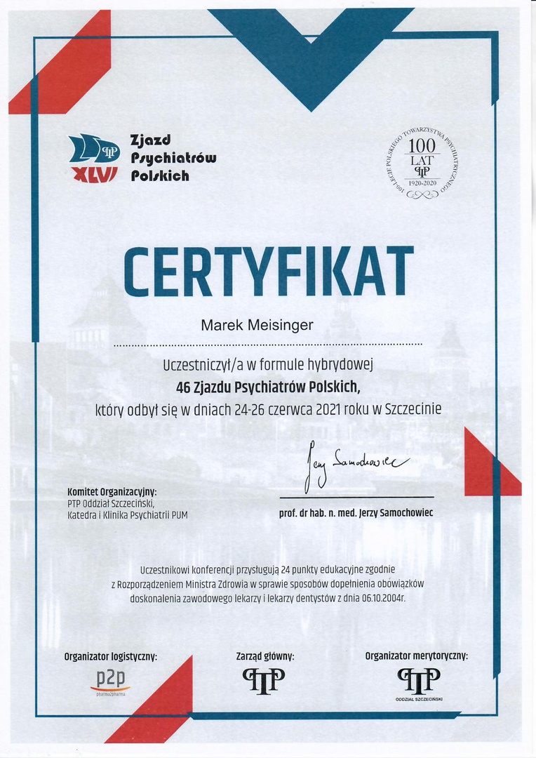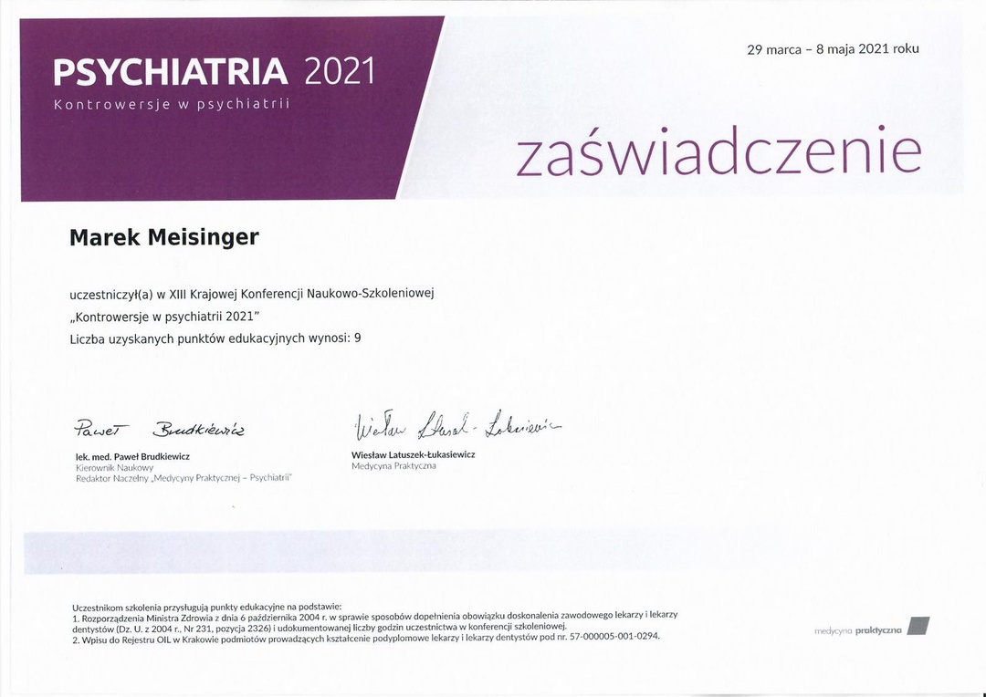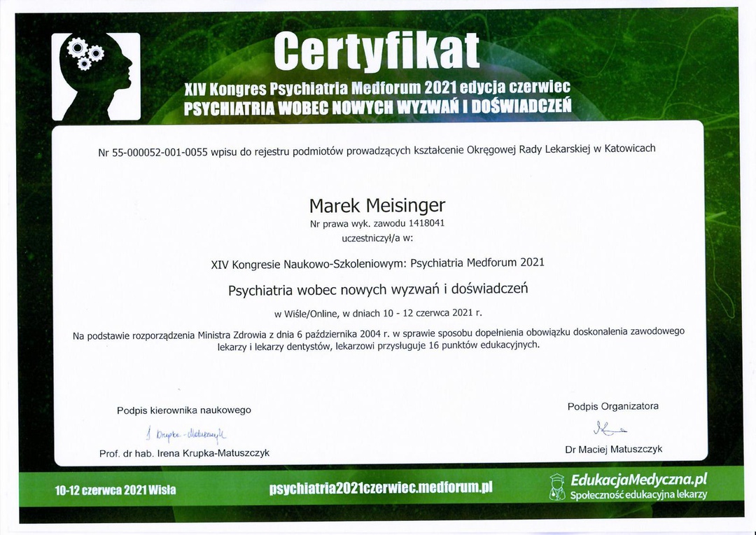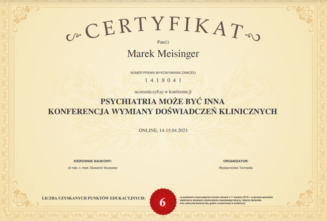 W czasie kilkunastoletniej praktyki zdobyłem doświadczenie zarówno w pracy ambulatoryjnej, jak i oddziałach psychiatrycznych, a także w Oddziale Psychiatrii Sądowej. Posiadam kilkuletnie doświadczenie jako biegły sądowy. Jestem absolwentem Wyższej Szkoły Bankowej we Wrocławiu z tytułem MBA.