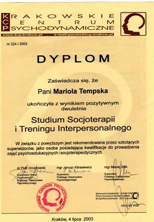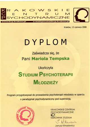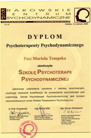 Prowadzę terapię w nurcie psychodynamicznym (posiadam certyfikat Polskiego Towarzystwa Psychoterapii Psychodynamicznej), a obecnie poszerzam wiedzę studiując psychoterapię psychoanalityczną w Szkole Psychoterapii Analitycznej w Warszawie (wiąże się to z udziałem we własnej analizie oraz regularnymi, pogłębionymi superwizjami psychoanalitycznymi).