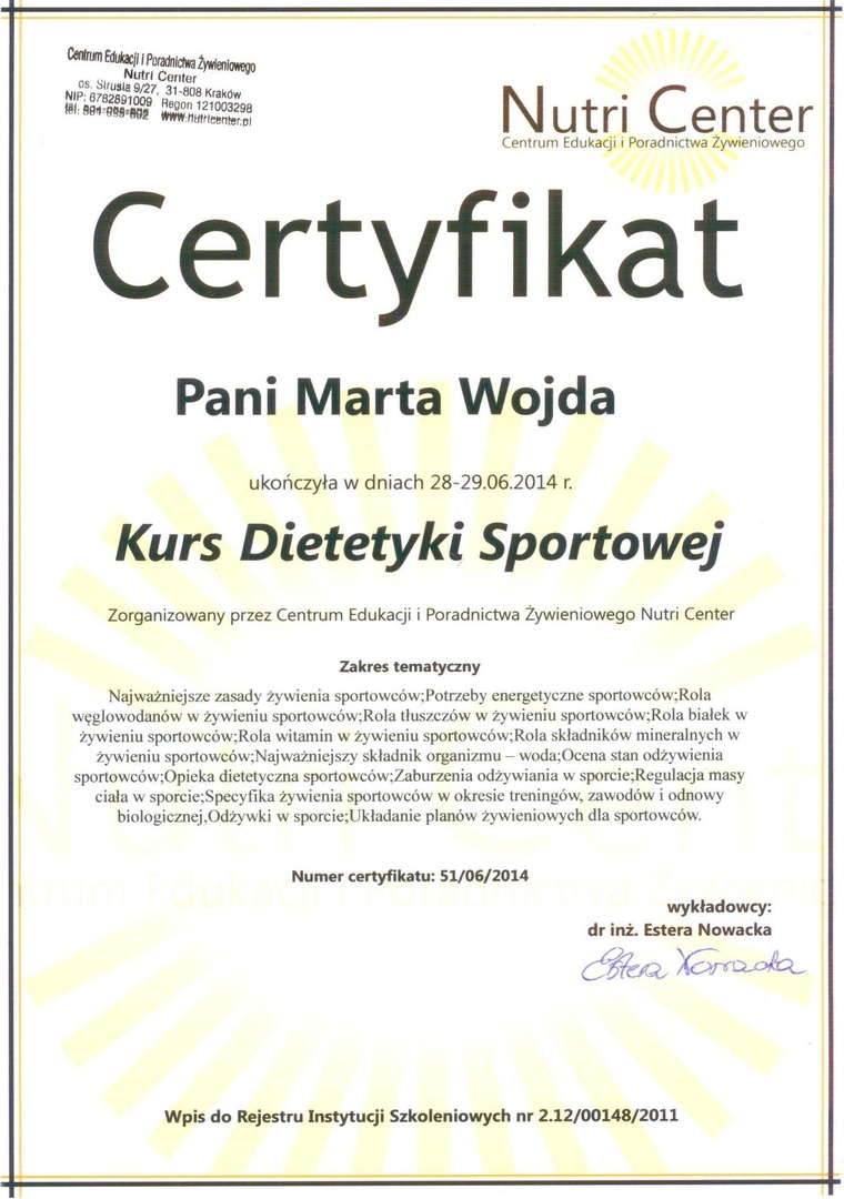 Jestem absolwentką Wydziału Nauk o Żywieniu Człowieka i Konsumpcji kierunku Dietetyka SGGW w Warszawie oraz instruktorka kulturystyki. Swoje doświadczenie zawodowe zdobywałam pracując w poradni dietetycznej gdzie zajmowałam się edukacją żywieniową, prowadzeniem dietetycznym pacjentów ze schorzeniami dietozależnymi, m.in. otyłością, schorzeniami tarczycy. Współpracowałam z klubami fitness przeprowadzając pomiary składu ciała, układając jadłospisy, oraz motywując osoby aktywne fizycznie do przestrzegania diety jak i treningów. Stale poszerzam swoją wiedzę uczestnicząc w szkoleniach, kursach jak i konferencjach związanych z dietetyką sportową i żywieniem w chorobach dietozależnych. Prywatnie uwielbiam gotować i eksperymentować w kuchni tworząc własne przepisy na zdrowe potrawy. Dbam o swoją kondycję fizyczną jeżdżąc na nartach i trenując na siłowni. Moje motto to : „Wszystko jest możliwe. Niemożliwe wymaga po prostu więcej czasu.”