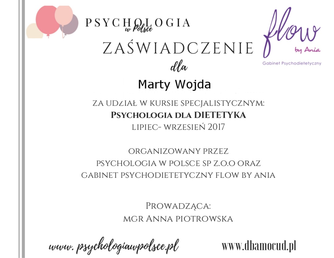 Polecam współpracę z Panią Martą, cała dieta układana zgodnie z moimi preferencjami i potrzebami. Stały kontakt dodatkowo motywuje do realizacji wszystkich założeń. Najważniejsze, że dieta działa a dzięki różnorodności smaków nie nudzi się.