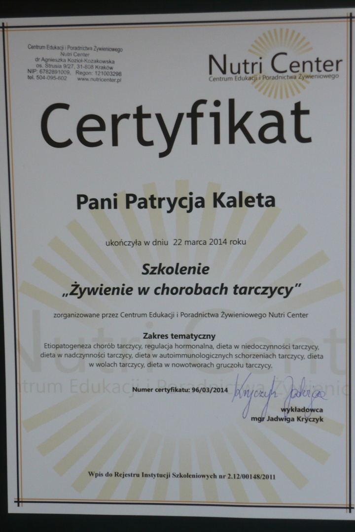 Nieustannie poszerzam swoją wiedzę, uczestnicząc w ponad 100 szkoleniach. Zajmuję się m.in. żywieniem w chorobach tarczycy, diagnozowaniem choroby Hashimoto, edukacją cukrzycy typu I i II oraz diety dla pacjentów z insulinoopornością. Interesuję się również problemami żołądkowo-jelitowymi, alergiami pokarmowymi i suplementacją dla sportowców. 📚🌱
