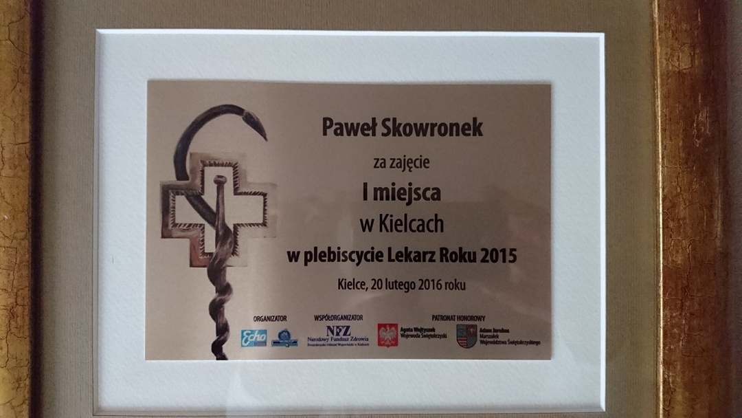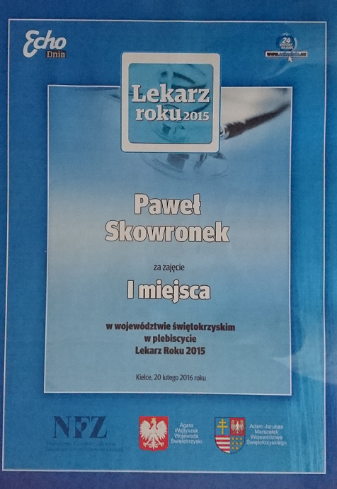 2015 – Nagroda Lekarza roku w Kielcach w roku 2014.
