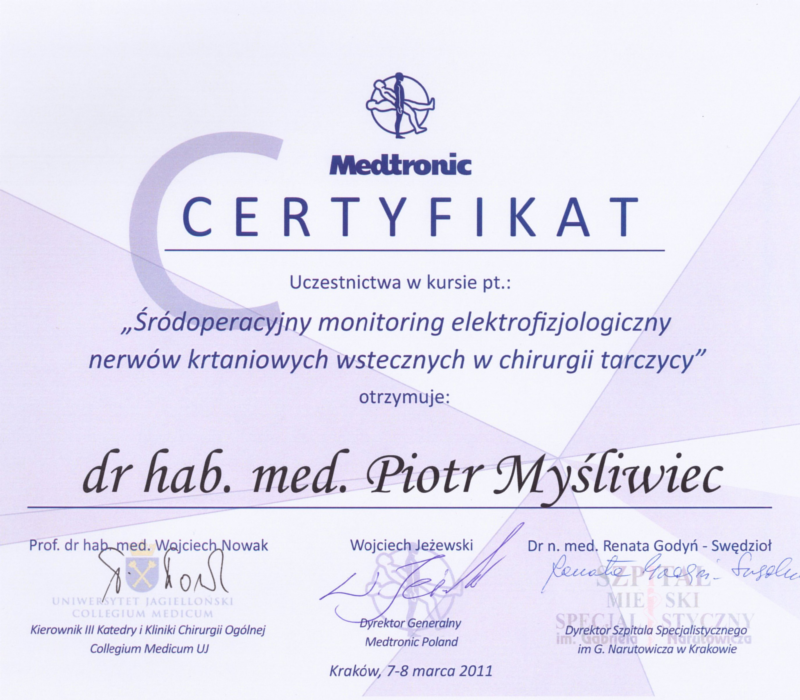 Jestem i zawsze już będę ogromnie wdzięczna za usunięcie guza nadnercza, którego dokonał P Profesor Piotr Myśliwiec , jego osobowość, sposób kontaktu z chorym , profesionalizm , wiedza zasługują na docenienie i wielki szacunek . Ogromnie dziękuję !