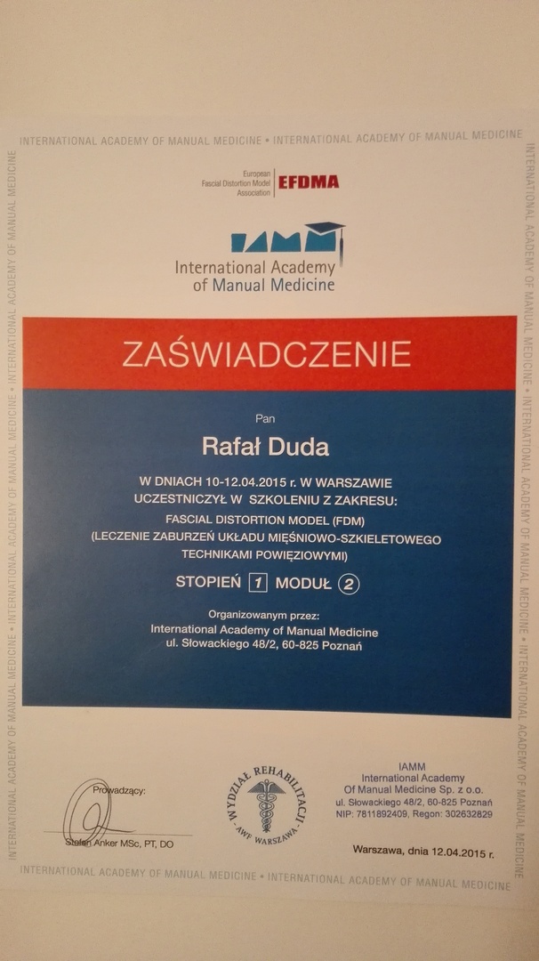 Nazywam się Rafał Duda - jestem fizjoterapeutą, terapeutą manualnym oraz terapętą metody FDM. Ukończyłem Akademie Wychowania Fizycznego im. J. Piłsudskiego w Warszawie, gdzie uzyskałam tytuł magistra fizjoterapii. Moją pasją i pracą jest pomaganie ludziom poprzez rozwiązywanie ich problemów związanych z narządem ruchu. Jeżeli ból i dyskomfort nie pozwala Państwu w pełni cieszyć się życiem to zapraszam. Razem dzięki ciężkiej pracy na pewno osiągniemy sukces.