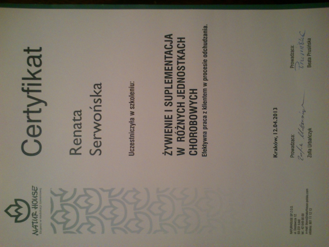 mgr Renata Przybyłowicz (Serwońska) – dietetyk. Absolwentka dietetyki, Wydziału Humanistyki i Zdrowia, Małopolskiej Wyższej Szkoły w Krakowie oraz Akademii Wychowania Fizycznego w Krakowie. Uczestniczka licznych kursów i konferencji naukowych dotyczących żywienia. Od 2011r. pracuje jako dietetyk w Centrach Dietetycznych Naturhouse w Krakowie. Posiada Certyfikaty ukończenia kursów m. in.: Dietetyka Kliniczna, Dietetyka Sportowa.