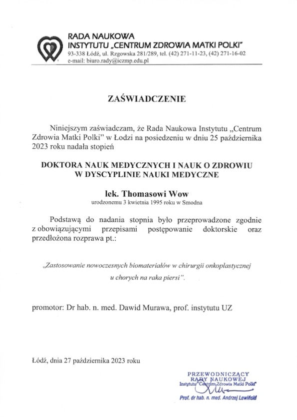 Absolwent Warszawskiego Uniwersytetu Medycznego, autor wielu publikacji naukowych z zakresu chirurgii piersi, obronił doktorat z zakresu chirurgii piersi, rezydent chirurgii …