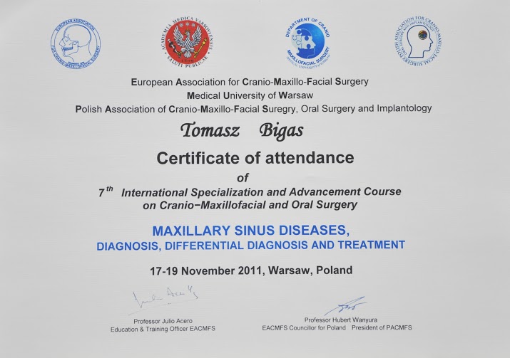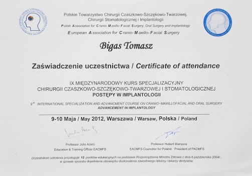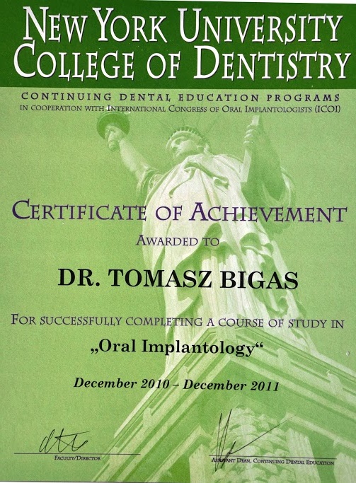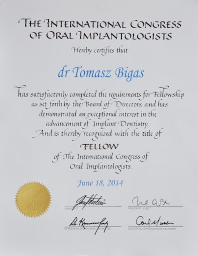- Tytuł implantologa przyznany przez amerykański International Congress of Oral Implantologist