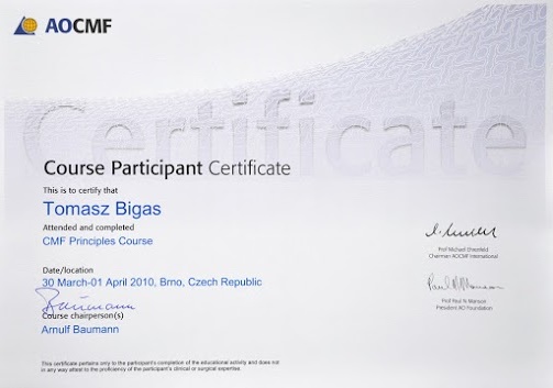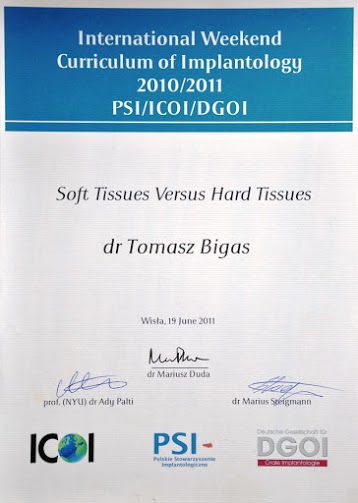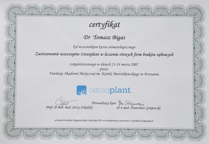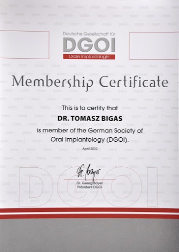 - Tytuł implantologa przyznany przez Deutsche Gesellschaft fur Orale Implantologie