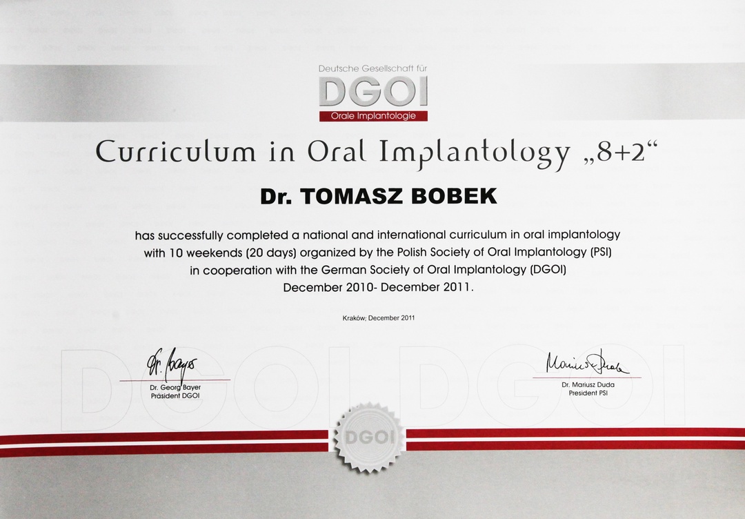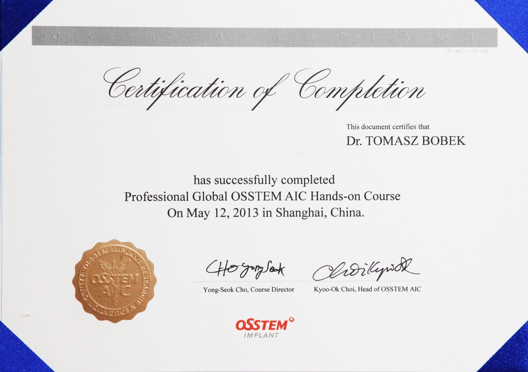 He has extensive experience in the field of implantology and oral surgery. His is continously extending his experience and attends numerous courses and symposiums in Poland and abroad: USA, Germany, Korea, UK, Ireland, China, Turkey and Cuba.