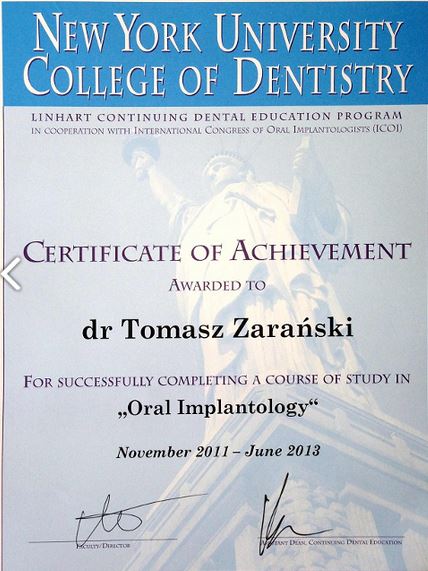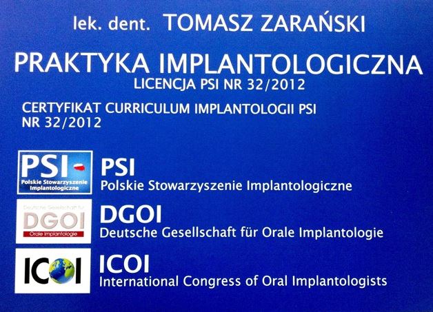 Jestem ekspertem do spraw implantologii stomatologicznej certyfikowanym przez International Congress of Oral Implantologists (ICOI), Deutsche Gesellschaft für Oral Implantologie (DGOI) oraz Polskie Stowarzyszenie Implantologiczne (PSI).