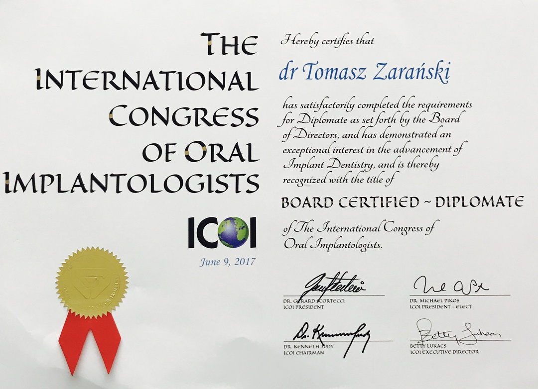 Posiadam tytuł Diplomate - najwyższy stopień międzynarodowych umiejętności implantologicznych ICOI.